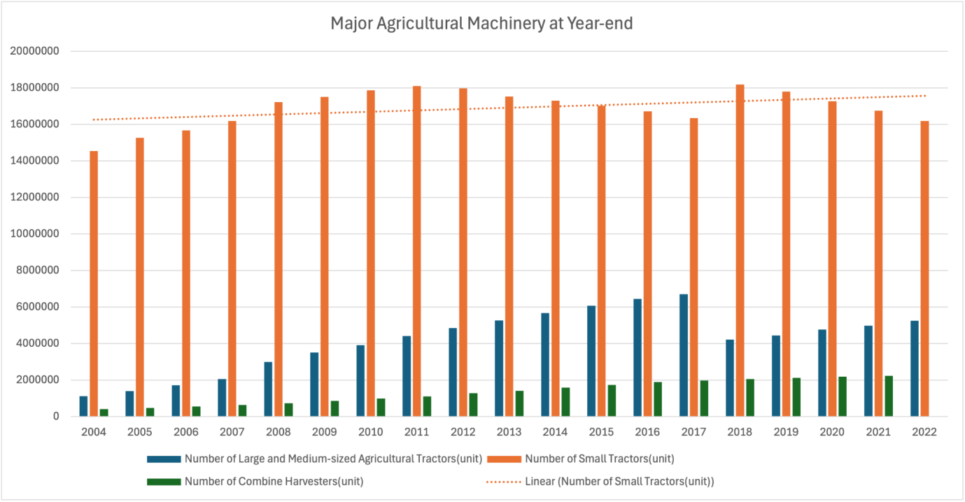 No gráfico acima pode-se observar a imensa quantidade de tratores pequenos na China. Em 2022, a quantidade de tratores pequenos correspondia a 75,5% de todos os tratores da China (16,1 milhões de unidades) versus 24,5% de tratores grandes e médios (5,2 milhões de unidades). Na série histórica (2004-2022), houve um crescimento no número de tratores grandes e médios de 1,1 milhões para 4,9 milhões e de 410,5 mil colheitadeiras combinadas para 2,2 milhões. De acordo com Ramos (2023), repórter do jornal Brasil de Fato na China, que compõe a Brigada Liang Jun, entre 2004 e 2015 a China “destinou 120 bilhões de yuans (mais de 82 bilhões de reais), para subsidiar a compra de mais de 35 milhões de máquinas. Durante esse período, o nível de mecanização agrícola na China passou de 33% para 61%. Atualmente, a cifra é de 73%”.